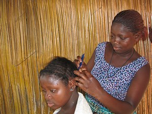 Germaine Aleka est en train de faire des tresses pour une cliente dans son salon de coiffure qui s’appelle “Esso Solame” (Dieu m’aime). “Pour chaque client, je prends une nouvelle aiguille propre. Si quelqu’un vient me demander de prêter les cisseaux, je ne le fait pas. L’hygiène,c’est très important.